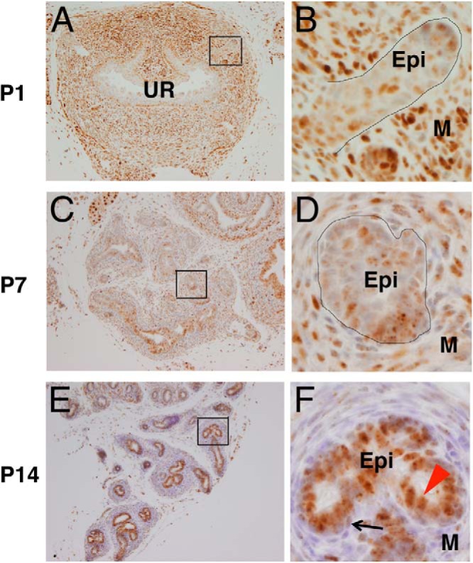 Figure 1. Bmp signaling was enhanced with the prostatic epithelial cell differentiation. A and B, Coronal sections of caudal body of ICR mice at P1; pSmad1/5/8 was weakly detected in the immature prostatic epithelia. C–F, Coronal sections of AP at P7 (C and D) and P14 (E and F). E and F, pSmad1/5/8 signal was more prominently observed in the differentiated luminal cells (F, red arrowhead) than that of the basal cells (F, black arrow) in the AP. UR, urethra. Epi, epithelia; M, mesenchyme. Scale bars, 100 μm. |