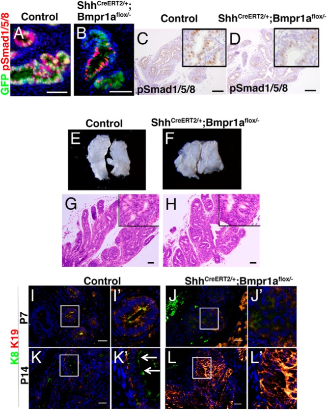 Figure 2. Defective prostatic epithelial differentiation was induced in the Bmpr1a-CKO mutants prostate. A, C, E, G, I, and K, Epithelial differentiation in the AP of control mice. B, D, F, H, J, and L, Epithelial differentiation in the AP of epithelial-specific Bmpr1a-CKO mutant mice. A and B, Costaining for green fluorescent protein (GFP) and pSmad1/5/8 in the AP at P14. Mosaic expression of GFP was detected only in the AP epithelia but not in the stroma of both control and Bmpr1a-CKO specimens (green). A and C, pSmad1/5/8 was localized primarily in the prostatic epithelia. B and D, Decreased pSmad1/5/8 expression was detected in the Bmpr1a-CKO specimens. E, Control AP ducts at P14. F, Bmpr1a-CKO mutant AP at P14. G and H, Histologic section of the control (G) and Bmpr1a-CKO mutant prostate (H). I–L, Costaining for K19 and K8 at P7 and P14. K, K19 was localized in basal epithelia and K8 was localized in the luminal epithelia of the control mouse prostate at P14 (K′, white arrows). K8 and K19 were aberrantly coexpressed at P14 in the Bmpr1a-CKO specimens (L). A–D and G and H, scale bars, 50 μm. I–L, scale bars, 20 μm. |
