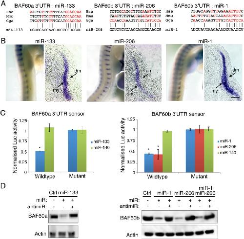 Fig. 3. miR-133 and miR-1/206 regulate the expression of BAF60a and BAF60b variants. (A) Alignment of putative miR-133, or miR-206 and miR-1 target sites in the 3′UTRs of chick (Gallus gallus, Gga), human (Homo sapiens, Hsa) and mouse (Mus musculus, Mmu) BAF60a and BAF60b genes. Nucleotides complementary to the respective miRNA are in red. The seed sequence of miR-133 is complementary to the predicted target site in the BAF60a 3′UTR and this is conserved in all three species. There is little variation outside the seed sequence. The seed sequences of miR-1 and miR-206, which are identical, are complementary to the predicted target site in the chicken BAF60b 3′UTR. In human and mouse BAF60b 3′UTR, fewer nucleotides are complementary to the miR-1 or miR-206 seed sequence, suggesting a non-canonical binding site where nucleotides outside the seed compensate. The number and position of complementary nucleotides outside the seed sequence vary between species and between miR-1 and miR-206, as these miRNAs differ outside the seed. In human/mouse, BAF60a and BAF60b are known as SMARCD1/Smarcd1 and SMARCD2/Smarcd2, respectively. (B) In situ hybridization using LNA probes shows myotome-specific expression of miR-133, miR-206 and miR-1 in HH20 embryos. my, myotome; dm, dermomyotome. Scale bar: 50 μm. (C) Luciferase sensors containing 3′UTR sequences of chick BAF60a or BAF60b were transfected into DF1 cells. Co-transfection of miR-133, miR-1 or miR-206 led to downregulation of luciferase expression compared with controls. Point mutations in the putative target site rendered the sensors non-responsive. Error bars indicate s.d.; *P<0.05 (t-test). (D) Endogenous BAF60a and BAF60b proteins are regulated by miR-133 or miR-1/206 in mouse NIH3T3 cells. Transfection with miR-133 led to reduced BAF60a protein levels; co-transfection of miR-133 with antimiR-133 restored BAF60a protein levels to that of mock transfected controls. Transfection with miR-1 or miR-206 or both led to reduced BAF60b protein levels; co-transfection of miRNAs with the relevant antimiR restored BAF60b protein levels to that of mock transfected controls. |