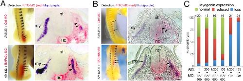 Fig. 5. Knockdown of BAF60a or BAF60b restores myogenesis after miRNA inhibition. (A) Somites injected with AM133 were electroporated with FITC-labeled control-MO or BAF60a-MO, as indicated. In situ hybridization for myogenin transcripts (purple) and detection of FITC-MO (red) shows that myogenic differentiation is inhibited in the presence of AM133 plus control-MO (top row, arrows and arrowheads); whole-mount and section are shown. Co-electroporation of BAF60a-MO with AM133 rescued the expression of myogenin (bottom row). (B) Somites injected with AM1 plus AM206 were electroporated with FITC-labeled control-MO or BAF60b-MO, as indicated. In situ hybridization for myogenin transcripts (purple) and detection of FITC-MO (red) shows that myogenic differentiation is inhibited in the presence of AM1 and AM206 plus control-MO (top row, arrows and arrowheads). Myogenin expression is rescued when BAF60b-MO is co-electroporated with AM1 and AM206 (bottom row, arrows and arrowheads). Scale bar: 50âµm. (C) Summary of phenotypes observed after AM/MO injections. my, myotome; nt, neural tube; nc, notochord. |
