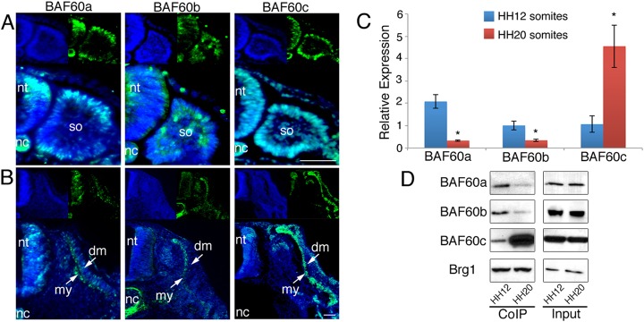 Fig. 1. Expression of BAF60 variants and Brg1/BAF complex composition during somite development. (A) Immunohistochemistry on somite sections of HH12 chick embryos illustrates the expression of all BAF60 variants (green) in epithelial somites. (B) Immunohistochemistry on somite sections of HH20 embryos shows expression of all BAF60 variants in the myotome. DAPI stain (blue) shows cell nuclei. Scale bars: 50 μm. (C) qPCR of HH12 and HH20 somites shows that relative amounts of BAF60a and BAF60b transcripts are decreasing, whereas transcripts encoding BAF60c are increasing during development. (D) CoIP using anti-Brg1 antibody and protein isolated from HH12 or HH20 somites. The amount of BAF60a and BAF60b protein bound to Brg1 decreases over time, whereas the amount of BAF60c variant associated with Brg1 increases in differentiating somites. Input samples are shown. dm, dermomyotome; my, myotome; nc, notochord; nt, neural tube; so, somite. |
