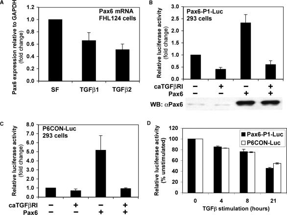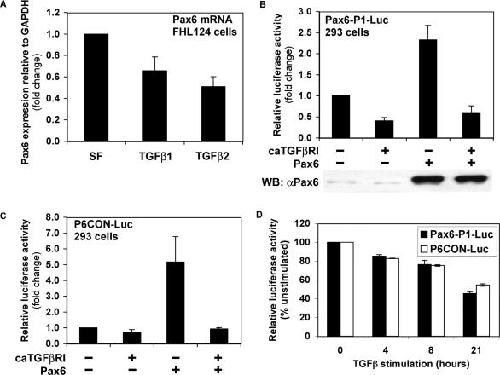 Figure 1. TGFβ represses Pax6 expression and autoregulation. (A) TGFβ inhibits Pax6 expression in human lens epithelial cells. FHL124 cells were serum starved for 24 hours and stimulated with 10 ng/ml TGFβ1 or TGFβ2 for a further 24 h. Total RNA was extracted and reverse transcribed. Endogenous Pax6 expression was quantified by quantitative real-time PCR. Data were normalized with mGAPDH control and represent mean +/−SEM (n = 4). (B) Constitutively activated TGFβ receptor I inhibits expression and autoregulation of the Pax6 P1 promoter in reporter assays. HEK-293 cells were transiently transfected with 2 μg of P1-Luc in combination with 5 μg of caTGFβRI or Pax6. Cells were lysed 48 h post-transfection and luciferase assays were performed. The data represent mean +/−SEM (n = 9). (C) Constitutively activated TGFβ receptor I inhibits Pax6 protein function in reporter assays. HEK-293 cells were transiently transfected with 2 μg of P6CON-Luc in combination with 5 μg of caTGFβRI or Pax6. Cells were lysed 48 h post-transfection and luciferase assays were performed. The data represent mean +/−SEM (n = 4). (D) Time-course-dependent repression of P1-Luc and P6CON-Luc in FHL124 cells by TGFβ ligand stimulation. FHL124 cells were transfected with 1 μg of Pax6-P1-Luc or P6CON-Luc using Lipofectamine 2000, serum-starved overnight, and stimulated with 5 ng/ml TGFβ for the times indicated. Cells were lysed and luciferase assays were performed (n = 3).