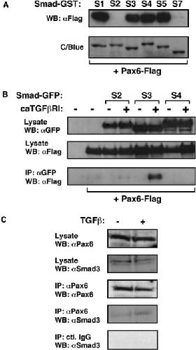 Figure 3. Interaction of Smads with Pax6. (A) Pax6 interacts with Smad1, 3, 4 and 5 in vitro. Lysates were prepared from HEK-293 cells that had been transiently transfected with p3xFlag-Pax6. These were then incubated with GST-Smad proteins bound onto glutathione beads. Following extensive washing, Pax6 associated with the Smad-GSTs was identified by elution of beads with SDS-Laemmli buffer, separation by 10% SDS-PAGE, and western blotting using a specific Pax6 antibody (Santa Cruz, cat. No. SC-20). GST alone was used as a control. The presence of the GST proteins was confirmed by staining gels with Coomassie Blue (C/Blue). (B) Pax6 interacts with Smad3 in the presence of constitutively activated TGFβ receptor I in vivo. HEK-293 cells were transfected as indicated. Pax6-Flag was immunoprecipitated with anti-FLAG antibody. Samples were separated by 10% SDS-PAGE and immunoblotted with anti-GFP antibody. (C) Pax6 and Smad3 interact endogenously in response to TGFβ stimulation of human lens epithelial cells.