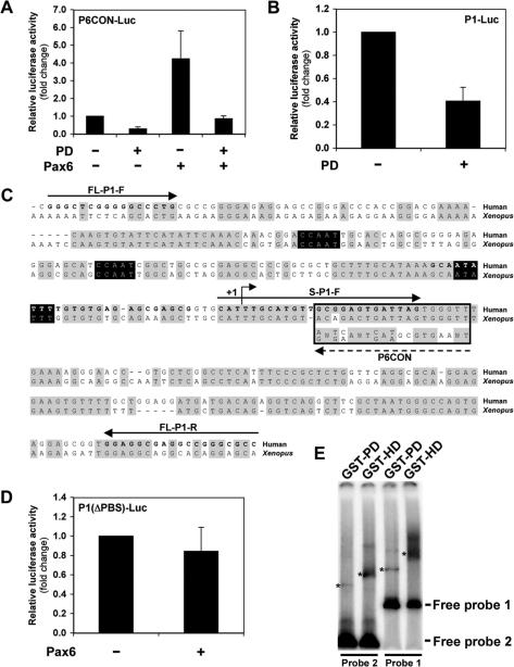 Figure 2. Pax6 paired domain mediates direct autoregulation of promoter P1. (A) An isolated Pax6 paired domain (PD) inhibits the function of full-length Pax6 in dominant negative manner. HEK-293 cells were transiently transfected with 2 μg of P6CON-Luc in combination with 5 μg of Pax6 or PD. Cells were lysed 48 h post-transfection and luciferase assays were performed. The data represent mean +/−SEM (n = 3). (B) Dominant negative paired domain (PD) inhibits the basal activity of promoter P1 indicating an autoregulatory component. HEK-293 cells were transiently transfected with 2 μg of P1-Luc in combination with 5 μg of PD. Cells were lysed 48 h post-transfection and luciferase assays were performed. The data represent mean +/−SEM (n = 5). (C) Alignment of the human and Xenopus Pax6 P1 promoters reveals an evolutionary conserved putative paired domain-binding site. Sequences of the human and Xenopus Pax6 P1 promoters were aligned in the region corresponding to the reporter construct P1-Luc. This alignment was then aligned to the consensus-paired domain binding sequence, P6CON, which is boxed (Note: this is the reverse-complement P6CON sequence as the putative binding site is encoded 5′ to 3′ on the opposite strand). A broken arrow indicates orientation of the P6CON consensus. Nucleotides matching the majority sequence are shaded in grey, while the TATA and CCAAT boxes are shaded in black. Bold letters indicate the location of PCR primers used to generate DNA probes for gel-shift assays, and solid lines indicate primer orientation. Human transcription start site is indicated as +1. (D) Deletion of a putative paired domain binding site in promoter P1 (P1(▵PBS)-Luc) disrupts Pax6 autoregulation. HEK-293 cells were transiently transfected with 2 μg of P1(▵PBS)-Luc in combination with 5 μg of Pax6. Cells were lysed 48 h post-transfection and luciferase assays were performed. The data represent mean +/−SEM (n = 5). (E) Gel mobility shift assay of GST-Pax6-PD and GST-Pax6-HD binding to the P1 promoter. Equal amounts of GST-Pax6-PD and GST-Pax6-HD were used as described in the materials and methods. Probe 1 was amplified using the PCR primers FL-P1-F and FL-P1-R, and Probe 2 using S-P1-F and FL-P1-R as indicated in the P1 sequence shown in Figure 2C. The actual primer sequences used here are provided in the materials and methods. The migration of the major shifted bands is indicated as (*).