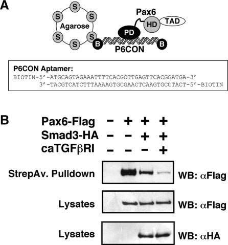 Figure 5. Smad3 prevents Pax6 paired domain from binding DNA. (A) Schematic representation of the experimental protocol for the DNA absorption assay together with the sequence of the biotinylated P6CON aptamer. (B) Biotinylated double-stranded P6CON oligonucleotide immobilized on streptavidin beads was incubated with lysates of HEK-293 cells transfected with the indicated expression plasmids. Pax6 bound to P6CON was analysed by immunoblotting using anti-Flag antibodies. The lower panels show the expression levels of Pax6-Flag and Smad3-HA proteins as analysed in immunoblots of the cell lysates.