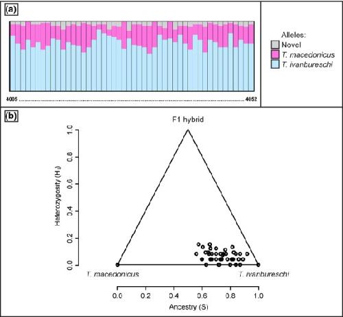 Fig 2. The potential of our methodological approach to detect genetic admixture. For a genetically admixed population positioned in the contact zone of Triturus ivanbureschi and Triturus macedonicus (the grey square labelled ‘H’ in Fig.1a), we show the proportion of alleles derived from the two parent species (a) and heterozygosity and ancestry as determined with hiest (b).