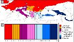 Fig 1. The potential of our methodological approach to delineate species. The map (a) shows the distribution of the seven crested newt (candidate) species, represented by different colours, and the geographical position of four populations sampled for each (numbered 1–28; n = 3 individuals per population). The grey square labelled ‘H’ is a genetically admixed population in the contact zone of Triturus ivanbureschi and Triturus macedonicus. Sampling details can be found in Table2 and Table S3, Supporting information. The baps plot (b), created with distruct (Rosenberg 2004), shows that each individual from populations 1–28 is allocated to its respective species.