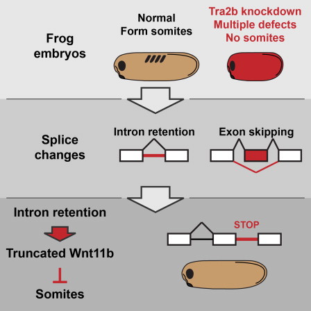 The alternative splicing regulator Tra2b is required for somitogenesis and regulates splicing of an inhibitory Wnt11b isoform.