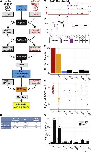 Figure 2. Analysis of Alternative Splicing in tra2b Morphants Shows Intron Retention as the Most Common Splice Change (A) Outline of the RNA-seq analysis pipeline. Condition-specific transcript assemblies are merged with JGI annotation, resulting in an augmented transcriptome assembly that forms the basis for DEXSeq testing of differential exon expression. (B) Table showing the number of novel transcripts found in this study and the number of significant splice changes in tra2b morphants. (C) RNA-seq reads from X. tropicalis control and morphants in tra2b locus show MO-induced intron retention (RI, blue box) and an increase in variable exon 2 (black arrow). (D) DEXSeq output showing fitted splicing (a proxy for the number of reads aligned) across all exonic regions. Control (black) and morphant (red) exon expression is similar except for the variable exon 2 and MO-induced retained intron, where the graphs diverge. Both events are significant (purple exons indicate adjusted p < 0.05). (E) Alternative splicing changes in morphants grouped by category show RI (red) as the most common event, followed by skipped or included exons (ESI, yellow). (F) A plot of individual alternative splicing events shows that retained introns are always included in morphants, whereas ESI events in all but two instances are included in normal embryos. (G) Most of the alternative splicing events detected are novel and are not described in the annotation. See also Figure S2 and Tables S1 and S2. |