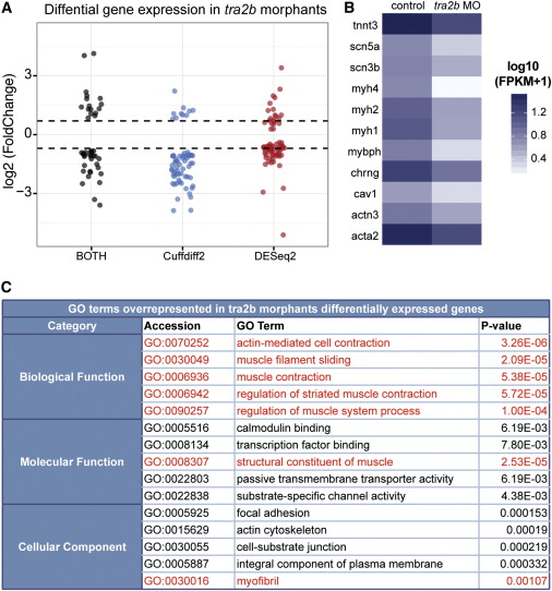 Figure 3. Differential Gene Expression in tra2b Morphants Confirms Reduction of Muscle Transcripts (A) Comparison of Cuffdiff2 and DESeq2 programs in calling significant changes in gene expression (X. tropicalis). (B) Heatmap showing muscle-related genes that are repressed in tra2b morphants. (C) Table showing the top five enriched GO terms in differentially expressed genes, with muscle-related GO terms indicated in red. See also Figure S3. |