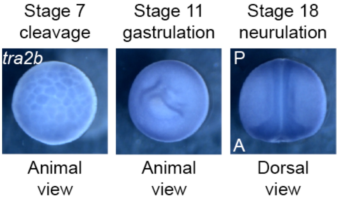 Figure S1, Related to Figure 1. Expression of tra2b in Xenopus laevis. Whole mount in situ hybridization was performed at the indicated stages. Embryos at stages 7 and 11 are viewed from the animal pole, and the stage 18 embryo is viewed dorsally with anterior (A) down and posterior (P) up. |