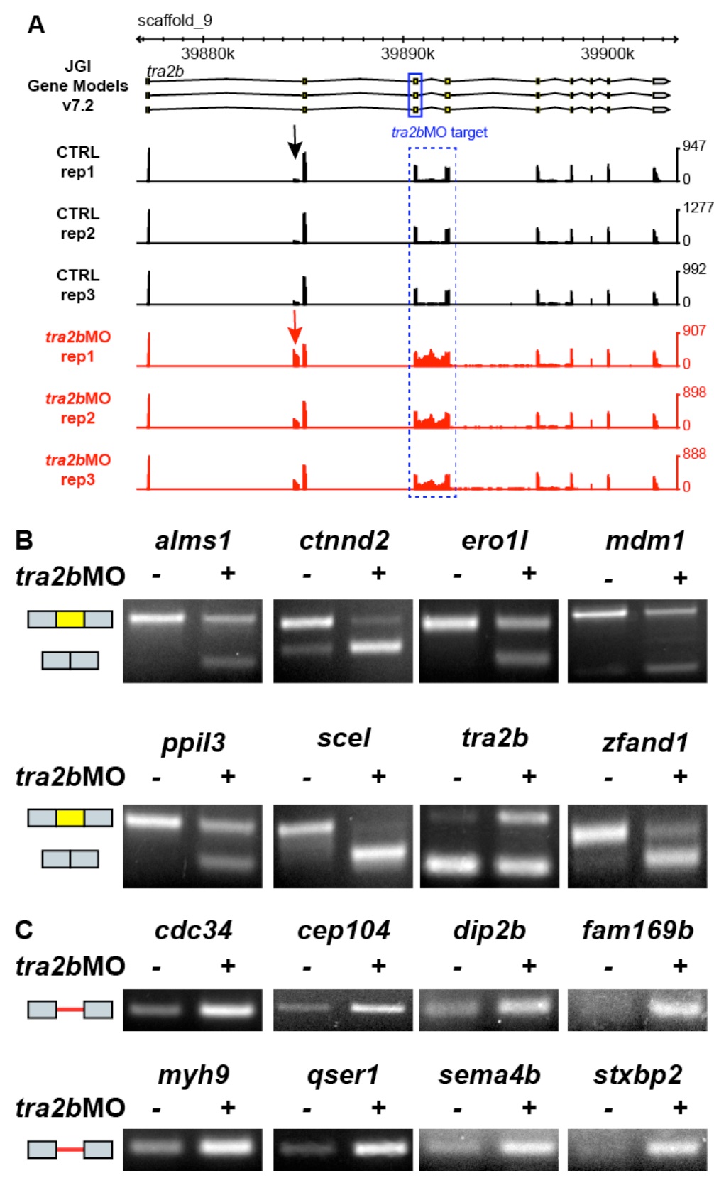 Figure S2, Related to Figure 2. RNA-seq Read Profiles from replicates showing tra2b locus and confirmation of splice changes. (A) Top shows X. tropicalis tra2b gene transcript models with splice junction targeted by tra2b-MO2 boxed in blue. Shown beneath is read profiles from three biological replicates of control (black) and tra2b morphants (red). Blue box in read profiles indicates intron retention in tra2b morphants induced by tra2b-MO2. Arrows indicate variable exon 2, which shows increased inclusion in tra2b morphants. (B) RT-PCR confirmation of ESI events. (C) RT-PCR confirmation of RI events. Data shown are from X. tropicalis. |