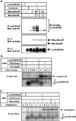 Figure 4. Smurf1âI-Smad complexes target ALK6 for ubiquitin-dependent degradation. (A) Smad6 enhances ubiquitination and degradation of ALK6 by Smurf1. Ubiquitination of c.a.ALK6 by Smad6âSmurf1 complexes was examined. 293T cells were transfected with the indicated plasmids and treated with 2.5 μM of lactacystin for 24 h before cell lysis. Lysates from cells were subjected to anti-FLAG immunoprecipitation followed by anti-HA immunoblotting. Polyubiquitination species of constitutively active forms of ALK6 ([FLAG-Ub]n-c.a.ALK6-HA) are indicated in the top panel. (B and C) Smurf1âSmad7 complex induced rapid turnover of ALK6. COS7 cells were transfected with c.a.ALK6-FLAG, FLAG-Smurf1, and/or Myc-Smad7. [35S]methionine- and cysteine-labeled cell lysates were immunoprecipitated by FLAG antibody. Immune complexes were subjected to SDS-PAGE and examined using a Fuji BAS 2500 bio-imaging analyzer. Arrowheads indicate the premature form of ALK6.