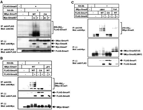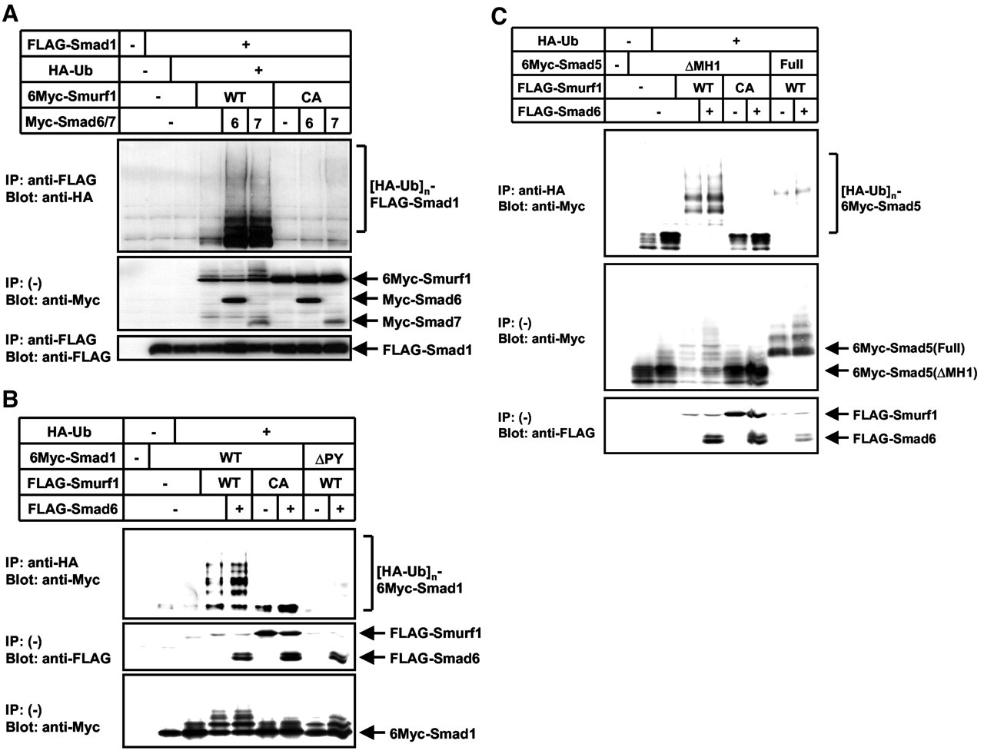Figure 6. Smad6/7 enhances ubiquitination and degradation of Smad1/5 by Smurf1. Ubiquitination of Smad1 (A and B) or Smad5 (C) by Smurf1 was examined. 293T cells were transfected with the indicated plasmids and treated with 2.5 μM lactacystin for 24 h before cell lysis. Lysates from cells were subjected to anti-FLAG immunoprecipitation followed by anti-HA immunoblotting (A) or anti-HA immunoprecipitation followed by anti-Myc immunoblotting (B and C). Polyubiquitinated species of Smads, [HA-Ub]n-FLAG-Smad1 (A), [HA-Ub]n-6Myc-Smad1 (B), and [HA-Ub]n-6Myc-Smad5 (C), are indicated in the top panels. Levels of expression of Smad1 or 5, Smad6/7, and Smurf1 were confirmed by immunoblotting and are shown in the bottom two panels.