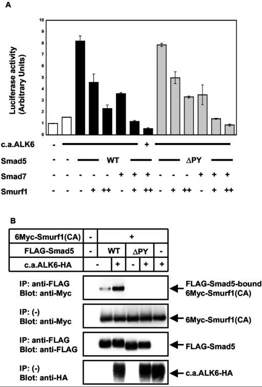 Figure 2. Smurf1 cooperates with Smad6 in cultured cells. (A) Effects of Smurf1 on the transcriptional activity of c.a.ALK6 in the presence of Smad5(WT) or Smad5(ÎPY) were examined using 3GC2-Lux assay. R mutant Mv1Lu cells were cotransfected with 3GC2-lux luciferase construct and various combinations of c.a.ALK6, Smad5(WT), Smad5(ÎPY), Smad7, and Smurf1 cDNAs. + and ++ are 0.1 and 0.3 μg of DNA, respectively, transfected in R mutant cells. (B) Binding of Smurf1(CA) to Smad5(WT) and Smad5(ÎPY) was examined in transfected COS7 cells. A Smurf1 mutant Smurf1(CA), which has a mutation in the HECT domain and fails to recruit ubiquitin ligase activity, was used for binding assays, including this experiment. COS7 cells were transfected with the indicated plasmids and subjected to FLAG-immunoprecipitation (IP) followed by Myc-immunoblotting (Blot). The top panel shows the interaction and the lower three panels the expression of each protein.