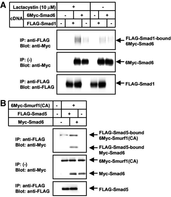 Figure 5. Smad6 recruits BMP-specific R-Smads to Smurf1 and enhances their ubiquitination and degradation. (A) Association of Smad6 with Smad1 is enhanced by treatment with proteasomal inhibitor lactacystin. COS7 cells were transfected with the indicated plasmids and treated with 2.5 μM lactacystin for 24 h before cell lysis. Lysates from cells were subjected to FLAG-immunoprecipitation (IP) followed by Myc-immunoblotting (Blot). (B) Interaction of Smurf1 with Smad5 is enhanced in the presence of Smad6. COS7 cells were transfected with the indicated plasmids, and lysates from cells were subjected to FLAG-IP followed by Blot.