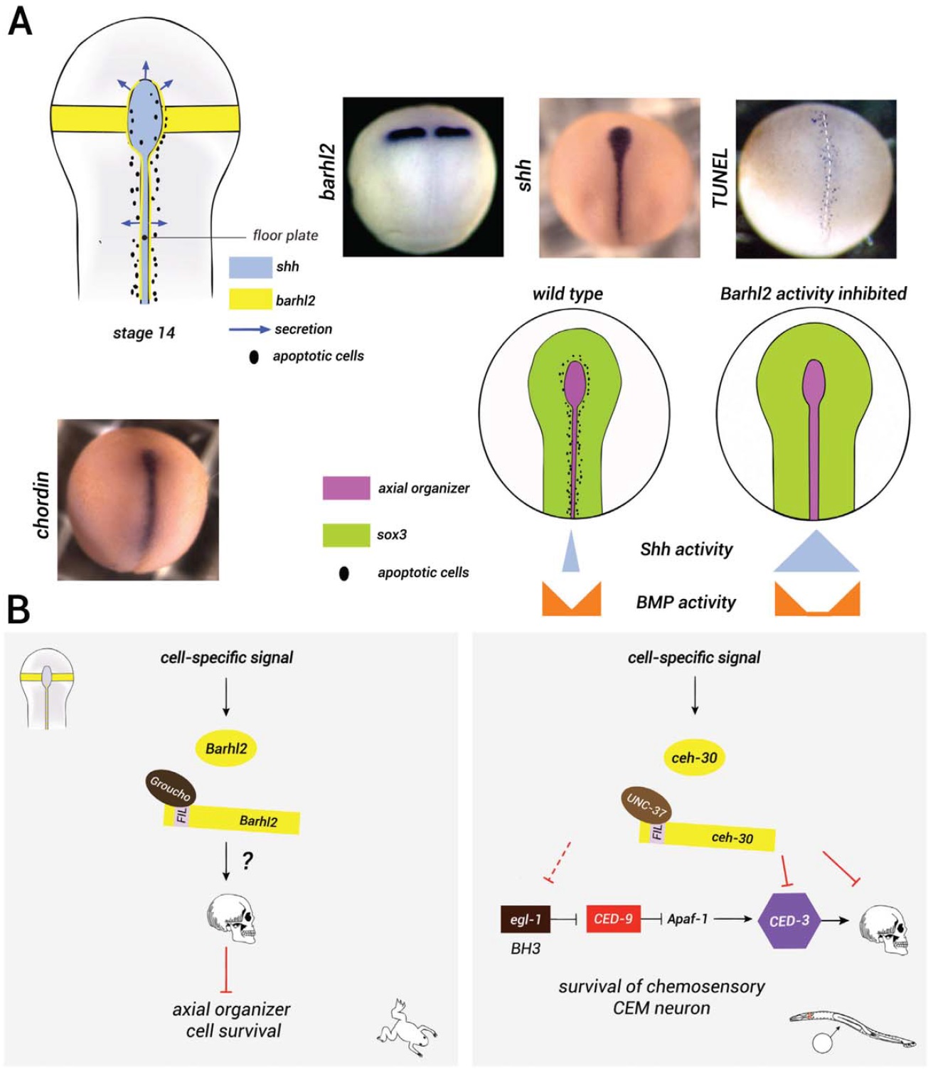 neurulation, Barhl2 regulates EPCD. Barhl2 interacts with Groucho and induces cell death of axial organizer cells expressing the morphogens