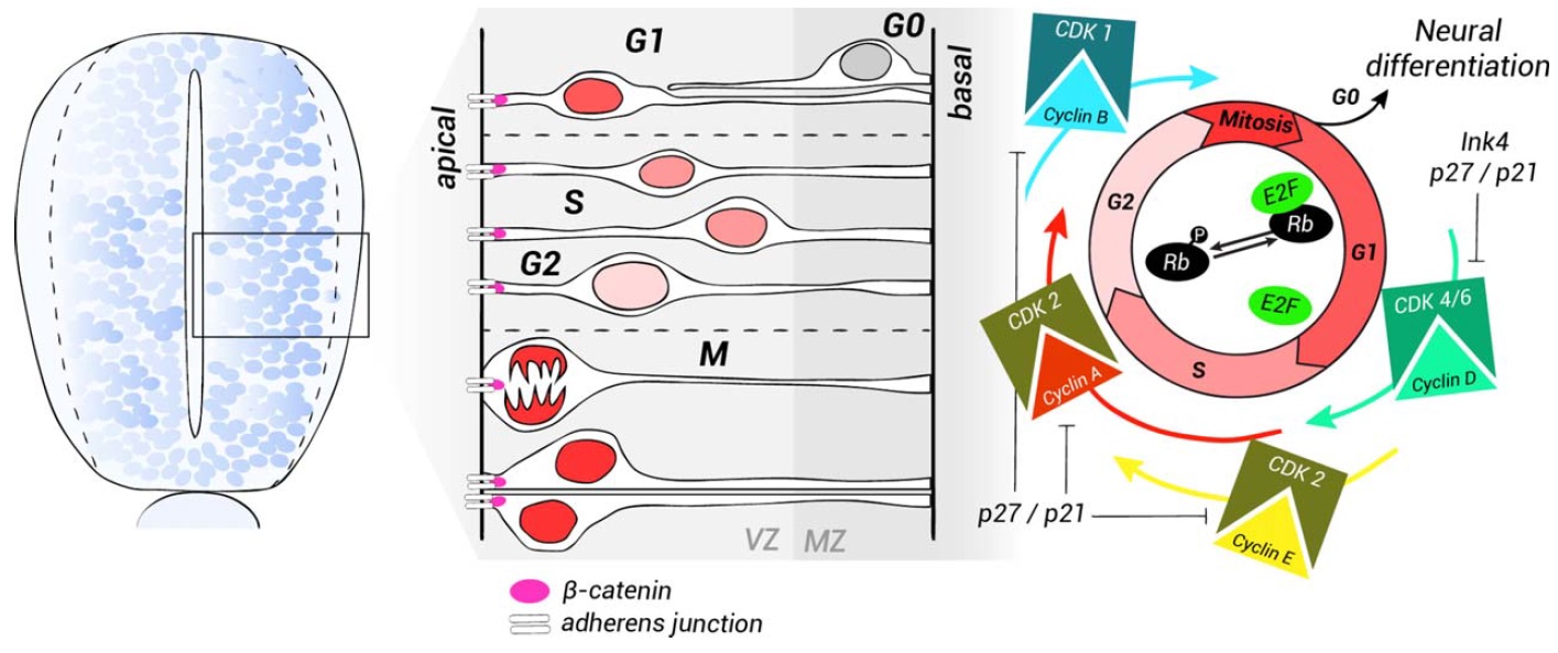 FIG. 3. Scheme illustrating cell-cycle dynamics in neural progenitors. The neuroepithelium is composed of a single layer of rapidly dividing