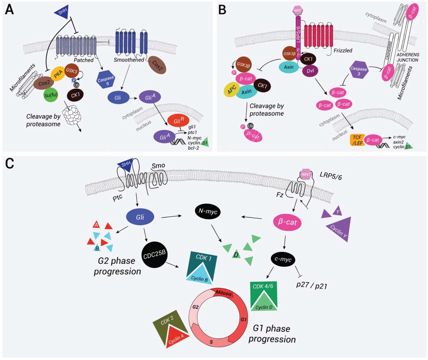 Wnt and the Shh pathways promotes cell-cycle progression. The Shh pathway mostly acts on the G2 and S phases through the regulation
