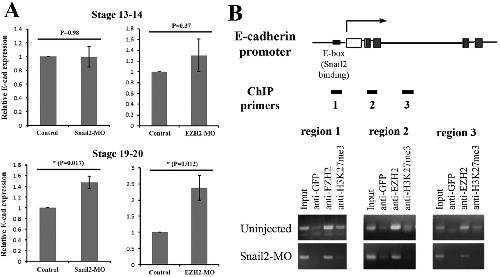 Fig. 8. Snail2 regulates EZH2 occupancy and H3K27me3 levels at the promoter of the Snail2 direct target E-cadherin during neural crest EMT. (A) Knockdown of Snail2 or EZH2 did not appreciably affect E-cad expression at early neurula stages 13-14, but resulted in increased E-cad expression at late neurula stages 19-20, when the neural crest underwent EMT to emigrate from the neural tube. Student's t-test revealed statistically significant changes in E-cad expression in morphant versus control samples at stages 19-20 (P<0.05). (B) Genomic structure around the E-cad promoter and the regions assayed in the ChIP experiments are shown at the top. Snail2-MO (20â ng) was injected into each blastomere of two-cell-stage embryos. Control and injected embryos were harvested at late neurula stages 19-20 for ChIP assay of EZH2 binding and H3K27me3 association with the E-cad promoter. Anti-GFP antibody was used as negative control. Knockdown of Snail2 reduced EZH2 occupancy and decreased H3K27me3 levels at the E-cad promoter, implying that Snail2 recruited EZH2/PRC2 to the E-cad promoter to deposit the repressive chromatin marks during EMT. |