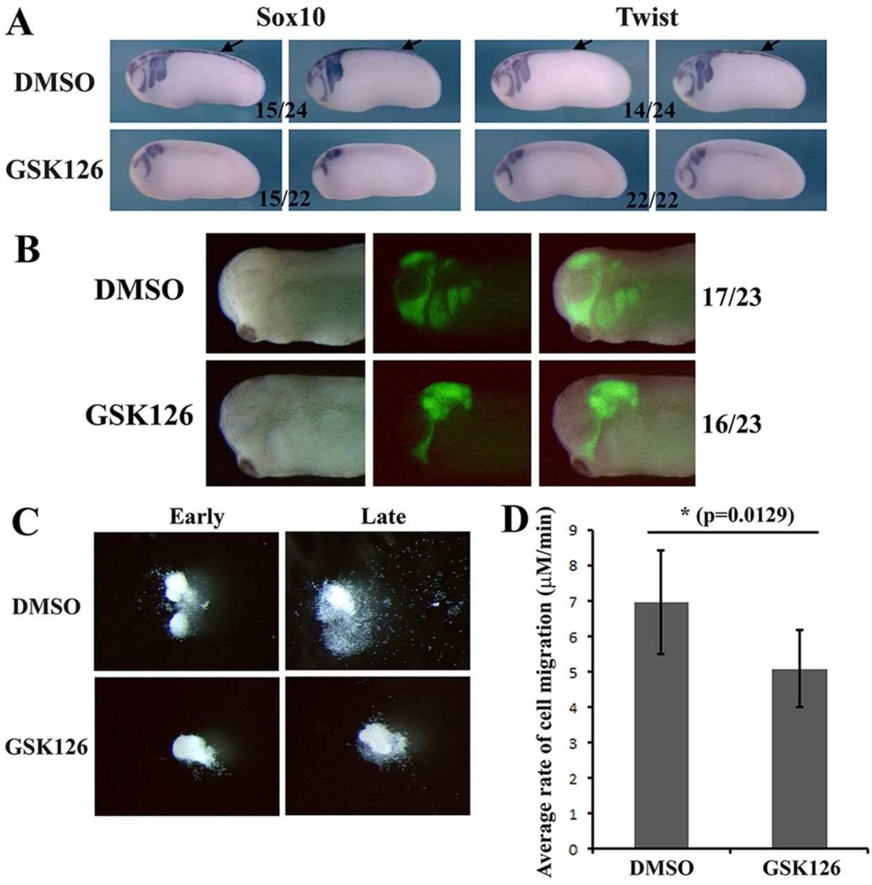 Fig. 6. EZH2 regulates neural crest migration. (A) Wild-type embryos were cultured in medium with DMSO or 50â µM EZH2 inhibitor GSK126 from stages 13-14 onward. The embryos were analyzed by ISH for Sox10 and Twist expression at tailbud stages 25-26. In DMSO-treated embryos, Sox10- and Twist-expressing cells migrated in distinct streams in the head. Treatment with GSK126 resulted in reduced migration of these cells. In addition, Sox10 and Twist expression in dorsal midline of the trunk (arrows) was eliminated by GSK126 treatment. (B) Neural crest tissues from fluorescein dextran-labeled donor embryos were transplanted into unlabeled control embryos at neurula stages 15-16. The embryos were cultured in medium with DMSO or 50â µM GSK126 until tailbud stages 26-28. Migration of the neural crest was examined by fluorescence microscopy. Whereas neural crest from DMSO-treated embryos migrated efficiently in the head, GSK126-treated embryos displayed defects in neural crest migration. (C) Neural crest explants were dissected from stage 15-17 embryos and cultured on fibronectin-coated dishes for about 16â h in the presence of DMSO or 8-10â µM GSK126. Migration of the neural crest was imaged between 2 and 16â h of culture. Whereas neural crest cells dissociated from the core explants and migrated efficiently in DMSO-containing medium, treatment with GSK126 reduced the migration of the neural crest on fibronectin. (D) Tracking of cell migration in time-lapse movies revealed that the velocity of neural crest cell migration was significantly reduced by treatment with GSK126. Four movies each for DMSO- and GSK126-treated samples were analyzed, with 60-170 cells tracked in each movie. |