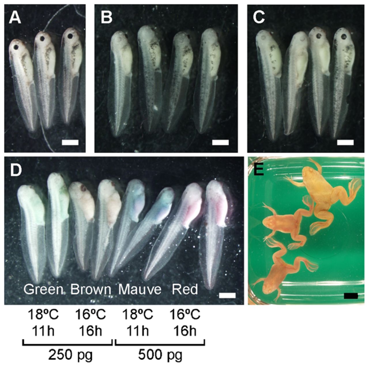 (A) Wild-type stage 39â40 tadpoles. (B,C) Fertilized eggs were injected with 500â pg of Tyr-TALEN mRNAs. Four of the stage 39â40 tadpoles were derived from the eggs from two different female frogs (B) and (C). (D) Oocytes were injected with Tyr-TALEN mRNAs, transferred into a host female, and fertilized. Each pair of stage 39â40 tadpoles is colored green, brown, mauve, or red from left to right. The green- and brown-colored tadpoles were derived from oocytes injected with 250â pg of mRNA. The mauve- and red-colored tadpoles were derived from oocytes injected with 500â pg of mRNA. The oocytes were matured by progesterone at 18°C for 11â hours for the green- and mauve-colored tadpoles. The oocytes were matured by progesterone at 16°C for 16â hours for the brown- and red-colored tadpoles. There was no difference between oocytes treated with progesterone at 18°C for 11â hours and those treated at 16°C for 16â hours. Tadpoles were selected randomly. (E) An image of the frogs derived from the oocytes that were injected with Tyr-TALEN mRNAs. Five of seven frogs showed perfect albino phenotypes. Scale barsâ=â1â mm (AâD) or 1â cm (E).
