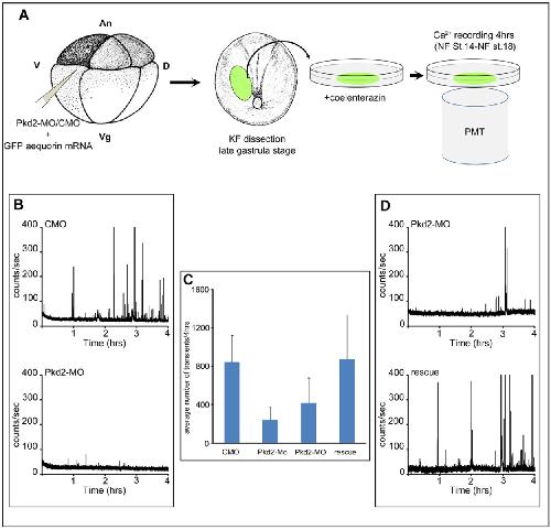 CMO or Pkd2-MO morpholinos were injected in the V2 blastomere of eight-cell stage embryos along with GFP–aequorin mRNA. Kidney field (KF) explants were