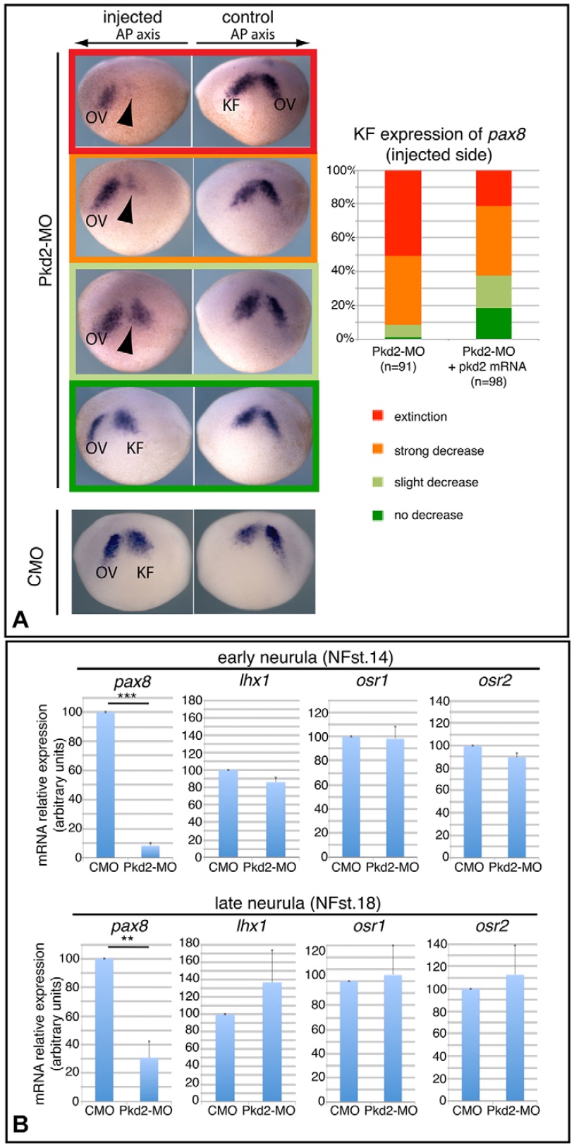 the presumptive otic vesicle; KF, mesodermal expression of pax8 in the kidney field. Arrows indicate orientation of antero-posterior (AP) axis. (C) Pkd2-MO