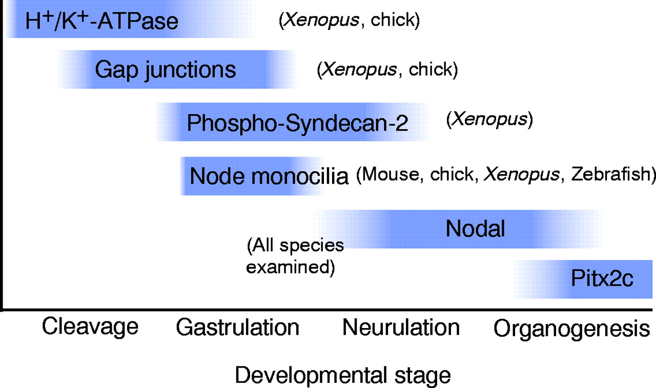 The striking left-right asymmetry of visceral organs is known to depend on left- and right-side-specific cascades of gene expression during early embryogenesis. Now, developmental biologists are characterizing the earliest steps in asymmetry determination that dictate the sidedness of asymmetric gene expression. The proteins and structures involved control fascinating physiological processes, such as extracellular fluid flow and membrane voltage potential and yet little is known about how their activities are coordinated to control laterality. By analogy with intercellular signalling in certain epithelial and endothelial cells, however, it is reasonable to speculate that at least three of these players, monocilia, gap junction communication and the Ca2+ channel polycystin-2, participate in a signalling pathway that propagates left-right cues through multicellular fields.