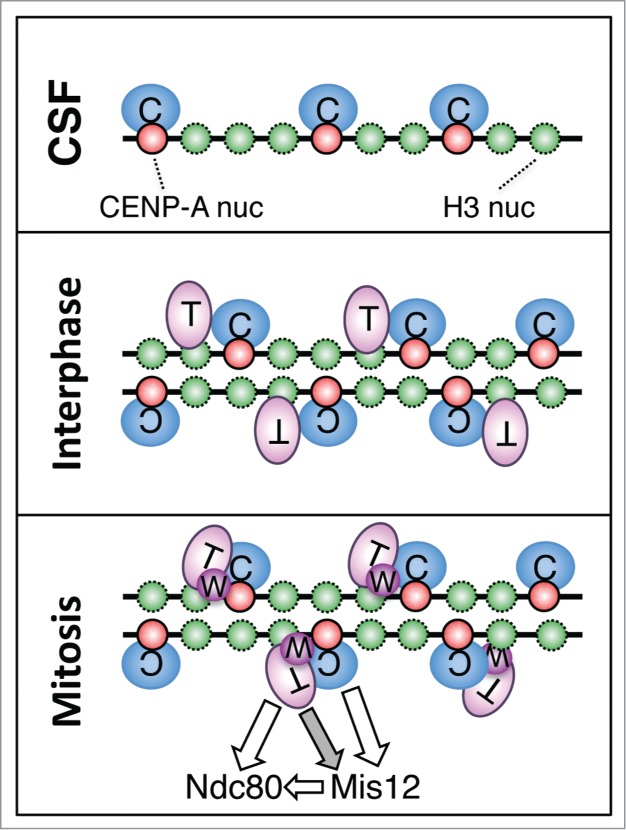 Figure 7. Sequential recruitment of CENP-C, CENP-T and CENP-W to centromeres in Xenopus egg extracts. CENP-C recognizes CENP-A and binds to centromeric chromatin when sperm is added to CSF extracts. When these extracts are driven to interphase, de novo loading of CENP-A occurs, which requires CENP-C but no CENP-T or CENP-W. The new CENP-A also recruits more CENP-C. Soon after DNA replication, CENP-T binds to centromeres. CENP-C is not strictly required for this process, but its presence may stabilize the incorporated CENP-T. Upon entry in mitosis, CENP-W can be detected at centromeres. CENP-C becomes more important for maintenance of CENP-T/W at this stage, most likely by providing stability to centromeric chromatin. Both CENP-C and CENP-T/W direct kinetochore assembly by recruiting Mis12C and Ndc80C, respectively. It is currently unclear how CENP-T affects Mis12C recruitment independently of Ndc80C (gray arrow), although a weak interaction between them has been detected in vitro.24