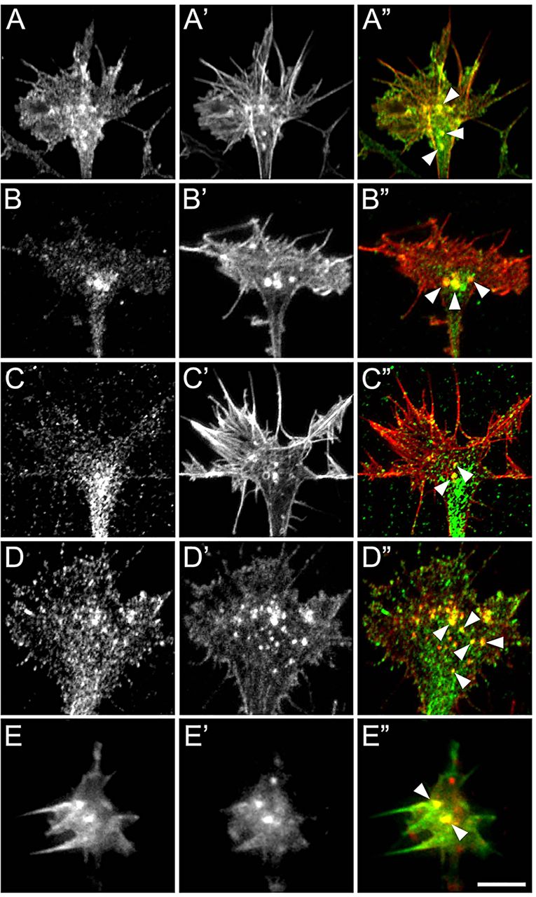 Fig. 4. F-actin foci colocalize with Cttn and other invadosome modulators within growth cones. (A-D) Confocal images of growth cones cultured on laminin and immunolabeled for Cttn (A), Arp3 (B), N-WASP (C) and Mena (D). (Aâ²,Dâ²) Phalloidin labeling of F-actin. (Aâ²-Dâ²) Merged images of the immunolabeling (green) and F-actin labeling (red). Note the strong colocalization of F-actin foci with immunolabeled proteins (arrowheads). (E-Eâ²) TIRF images of a live growth cone on laminin expressing both GFP-α-actinin (E) and mCh-UtrCH (Eâ²). Note in the merged image (Eâ²) that α-actinin targets to mCh-UtrCH-labeled F-actin foci (arrowheads). Scale bar: 5â µm. |