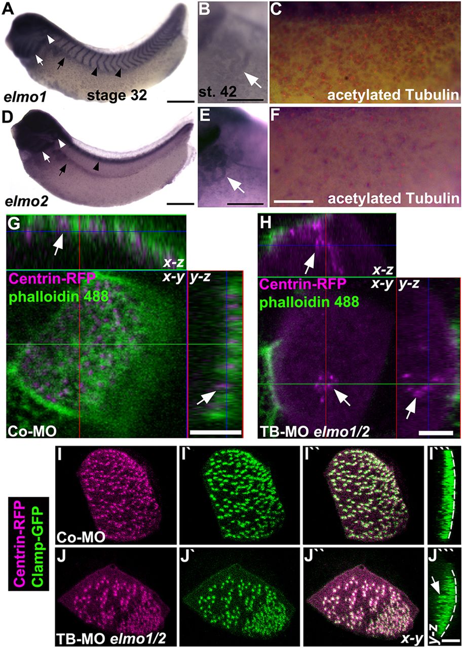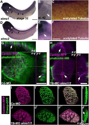 Fig. 2. ELMO1 and ELMO2 are expressed in ciliated organs and are required for ciliogenesis in Xenopus. (A-F) Expression of elmo1 (A-C) and elmo2 (D-F) in the head, branchial arches (white arrow in A,D), otic vesicle (white arrowhead), pronephric kidney (black arrow), throughout the epidermis at stage 32, and in the pronephric tubules (white arrow in B,E) at stage 42 of Xenopus development. In addition, elmo1 is expressed in the intersomitic vessels and elmo2 in the spinal cord at stage 32 (black arrowheads). Expression of elmo1 and elmo2 colocalised with acetylated Tubulin marking cilia at stage 32 (C,F; see also supplementary material Fig. S5C). (G,H) Xenopus embryos (stage 32) injected with TB-MO elmo1 and TB-MO elmo2 (each 4â ng) and centrin-RFP mRNA colabelled with phalloidin 488 (for F-actin) revealed impaired migration and docking of basal bodies (arrows) to the apical membrane (H) as compared with embryos injected with Co-MO (8â ng) (G). (I-Jâ´) Injection of Xenopus embryos (stage 32) with a lower dose of the TB-MOs (each 2â ng) together with centrin-RFP and clamp-GFP mRNAs revealed partial basal body docking (arrows) and irregular basal body spacing (I-Jâ´) compared with proper apically docked and evenly distributed basal bodies in embryos injected with Co-MO (4â ng) (I-Iâ´). Dashed line indicates the apical surface. Scale bars: 500â μm in A,D; 250â µm in B,E; 2â mm in F; 5â µm in G,H,Jâ´. |