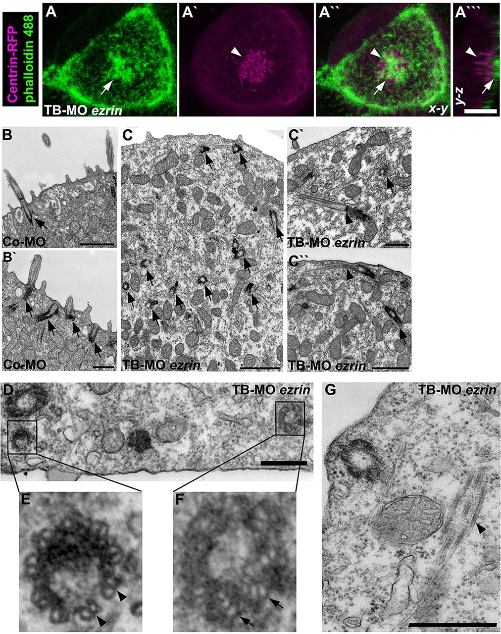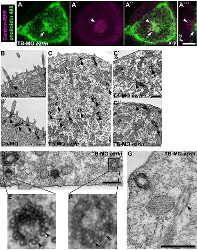 Fig. 5. Ezrin depletion leads to impaired actin remodelling and intracellular ciliary axoneme formation in Xenopus MCCs. (A-Aâ´) Increased actin accumulation (arrows) directly above the cluster of Centrin-RFP-labelled basal bodies (arrowheads) in Xenopus embryos (stage 32) injected with TB-MO ezrin (8â ng) and stained with phalloidin 488. (B-Câ²) TEM analysis revealed basal body migration and docking defects (arrows) and intracellular axoneme formation (arrowheads) in Xenopus embryos (stage 32) injected with TB-MO ezrin (8â ng) (C-Câ²) as compared with proper apically docked basal bodies (arrows) of Co-MO (8â ng) morphants (B,Bâ²). (D-G) TEM analysis revealed that Xenopus embryos (stage 32) injected with TB-MO ezrin (8â ng) exhibit a normal ultrastructure of intracellular axonemes with nine outer microtubule doublets and two central microtubule doublets (arrowheads in E,G) and basal bodies with nine peripheral microtubule triplets (arrows in F). Scale bars: 5â μm in Aâ´; 1â μm in B,C,Câ²; 0.5â μm in Bâ²,Câ²,D,G. |