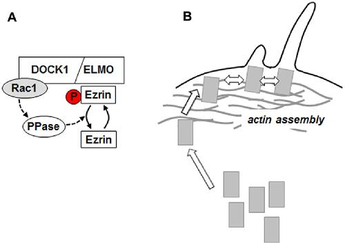 Fig. 8. Model illustrating ELMO-DOCK1-Rac1 and their interaction with Ezrin and the effects on basal body migration and spacing in MCCs. (A) The ELMO-DOCK1 complex localises to the ciliary basal body and acts as bipartite guanine nucleotide exchange factor for Rac1. Rac1 in turn dephosphorylates Ezrin via an unknown phosphatase (PPase). Dephosphorylated Ezrin does not bind to actin filaments, whereas phosphorylated Ezrin serves as a linker between the basal body and actin filaments. (B) Constant turnover of phosphorylated Ezrin regulated by ELMO-DOCK1-Rac1 is necessary to promote basal body migration along actin filaments (arrows) and for basal body docking to the membrane and spacing (double arrows) with assembly of the apical and subapical actin network. |