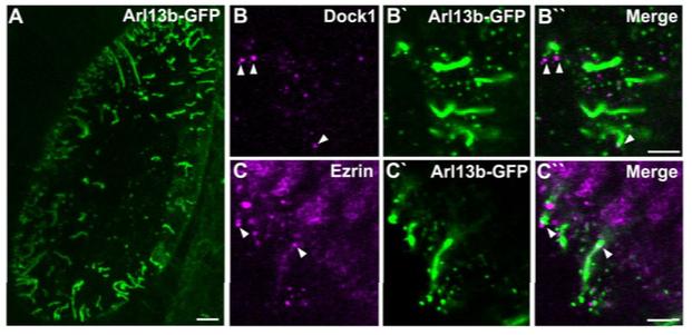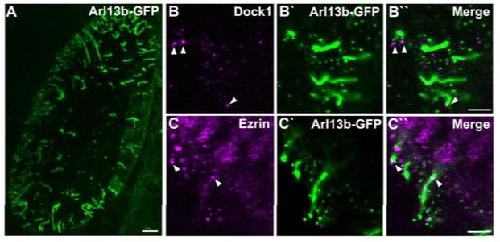 Supplemental Fig. S3. Expression of Dock1 and Ezrin in the ciliary axonemes of the otic vesicle in zebrafish (A) Immunostaining shows expression of Arl13b-GFP in ciliary axonemes of the otic vesicle of Tg(actb2:Mmu.Arl13b-GFP) embryos at 48 hpf. (B-B``) Dock1 is expressed at the basal bodies (white arrowheads) in the otic vesicle of Tg(actb2:Mmu.Arl13b-GFP) embryos at 48 hpf. (C-C``) Ezrin is expressed at the basal bodies (white arrowheads) and the ciliary axonemes in the otic vesicle of Tg(actb2:Mmu.Arl13b-GFP) embryos at 48 hpf. Scale bars, 5 μm (A,B``,C``). |