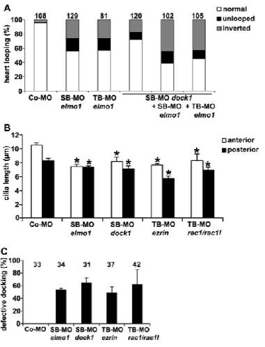Genes referenced: arl13b cep164 dock1 elmo1 elmo2 ezr msn psmd6 rac1 tuba4a tubg1