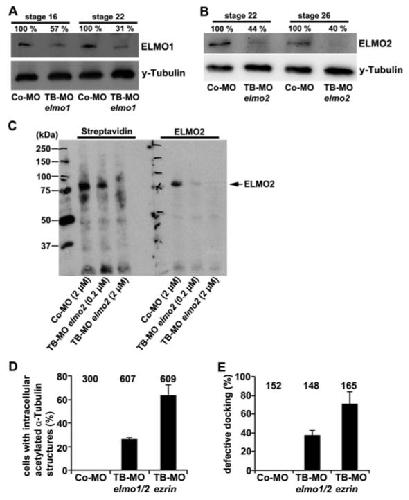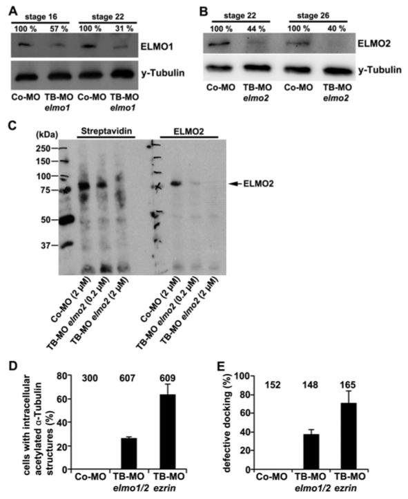 Supplemental Fig. S6. Knockdown efficiency and defective ciliogenesis upon knockdown of ELMO1/2 and Ezrin in Xenopus (A) Immunoblot of Xenopus lysates (stage 16 and 22) after injection of TB-MO elmo1 (8 ng) into both blastomeres of two-cell stage Xenopus embryos indicates strong reduction of ELMO1 expression compared to Co-MO (8 ng) injected embryos. Anti-γ-Tubulin immunoblot served as loading control. (B) Immunoblot of Xenopus lysates (stage 22 and 26) after injection of TB-MO elmo2 (8 ng) into both blastomeres of two-cell stage Xenopus embryos indicates strong reduction of ELMO2 expression compared to Co-MO (8 ng) injected embryos. Anti-γ-Tubulin immunoblot served as loading control. (C) In vitro translated Xenopus ELMO2 protein was detected via immunoblotting by Streptavidin or ELMO2 antibody. ELMO2 protein level decreased in the presence of 0.2 μM and 2 μM of the TB-MO elmo2. Immunofluorescence-based quantification of cells with intracellular acetylated ï¡-Tubulin-positive structures (D) and cells with defective centriole docking (E) of TB-MO elmo1/elmo2 (each 4 ng) and TB-MO ezrin (8 ng) injected Xenopus embryos compared to Co-MO (8 ng) injected Xenopus embryos at stage 32. Numbers indicate epidermal cells of three different embryos used for quantification. |