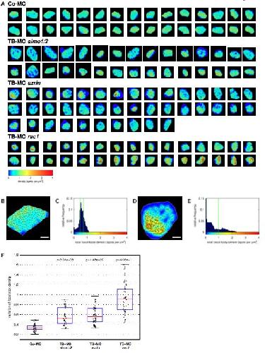 Supplemental Fig. S7. Quantification of the regularity of the centriole spacing (A) Local basal body density for all recorded multiciliated skin cells in Xenopus embryos. (B) Local basal body density for a cell of a Co-MO (4 ng) injected embryo. (C) Histogram of the local basal body density in the control cell depicted in B. The green lines mark the 25 % and 75 % quantiles. (D,E) Analysis as in B,C for a cell of a TB-MO ezrin (4 ng, low dosage) injected embryo. The larger variation of the local spot density results in a wider distribution with a larger interquartile range. (F) Homogeneity of the basal body distribution measured by the interquartile range of the local spot density. Each point corresponds to one cell. The blue boxes denote the 25 % and 75 % quantile, the red line indicates the median. The p-values (computed with the two-sided Wilcoxon rank sum test) show signifcant differences to the control. Scale bars: 5μm (B,D). |