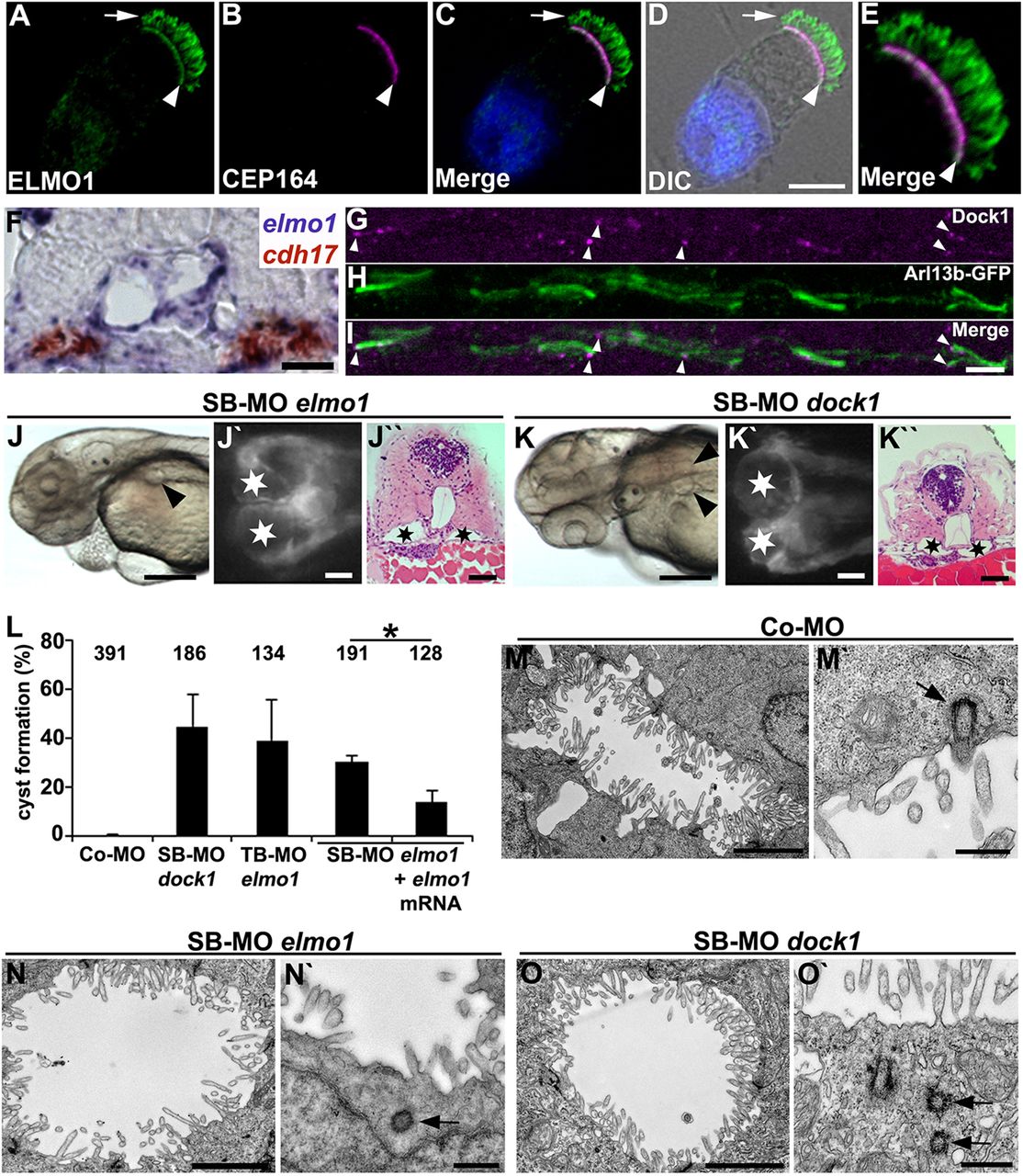 Fig. 1. ELMO1 and DOCK1 show expression in cilia in human and zebrafish and are required for ciliogenesis in zebrafish. (A-E) Human respiratory epithelial cells from healthy controls were double labelled with antibodies against ELMO1 (green) and CEP164 (magenta). ELMO1 localises along the ciliary axonemes (arrow) and the basal bodies (arrowhead). The nucleus is stained with Hoechst 33342 (blue). (F) Transverse section of a 24â hpf zebrafish embryo reveals that elmo1 mRNA expression (blue) partially colocalises with cadherin 17 (cdh17) mRNA (red) in the pronephric tubule. (G-I) Dock1 is expressed at the base of the cilium (arrowheads) and ciliary axonemes (green fluorescence of Arl13b-GFP) in 48â hpf Tg(actb2:Mmu.Arl13b-GFP) zebrafish embryos. (J-Kâ²) Expression silencing of elmo1 (J-Jâ²) and dock1 (K-Kâ²) using SB-MO elmo1 (2â ng) and SB-MO dock1 (2â ng), respectively, resulted in pronephric cyst formation (arrowheads and stars), as shown in a bright-field lateral view with anterior to the left (J,K), a dorsal view with anterior to the left of a Tg(wt1b:EGFP) embryo (Jâ²,Kâ²), and in a transverse section (Jâ²,Kâ²) of 48â hpf embryos. (L) Quantification of pronephric cyst formation in 48â hpf zebrafish embryos injected with Co-MO, SB-MO dock1, TB-MO elmo1 and SB-MO elmo1 (each 2â ng) or SB-MO elmo1 (2â ng) + elmo1 mRNA (20â pg). There was significant prevention of cyst formation upon co-injection of elmo1 mRNA (*Pâ¤0.05). The number of individual embryos analysed is indicated above each bar. (M-Oâ²) Analysis of electron micrographs revealed basal body docking defects (arrows) in 48â hpf zebrafish embryos injected with SB-MO elmo1 (2â ng) (N,Nâ²) or SB-MO dock1 (2â ng) (O,Oâ²) as compared with Co-MO (2â ng) (M,Mâ²). Scale bars: 10â µm in D; 20â µm in F,Jâ²,Kâ²; 100â µm in I; 50â μm in J,K,Jâ²,Kâ²; 2â μm in M,N,O; 0.5â μm in Mâ²,Nâ²,Oâ². |