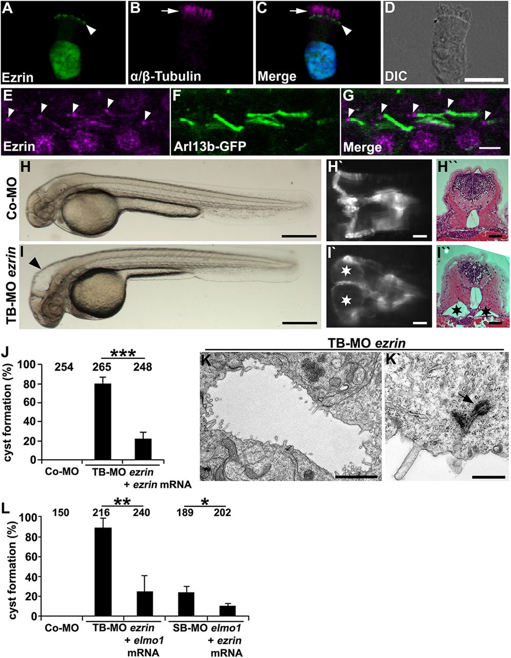 Fig. 3. Ezrin shows expression in cilia and is required for ciliogenesis in zebrafish. (A-D) Human respiratory epithelial cells from healthy controls were double labelled with antibodies directed against Ezrin (green) and the ciliary axoneme marker α/β-Tubulin (magenta) (arrow). Ezrin localisation is restricted to the putative basal bodies (arrowhead) and the nucleus. The nucleus is stained with Hoechst 33342 (blue). (E-G) Ezrin is expressed at the basal bodies (arrowheads) and the ciliary axonemes in 48â hpf Tg(actb2:Mmu.Arl13b-GFP) zebrafish embryos. (H-Iâ²) Expression silencing of ezrin (I-Iâ²) using TB-MO ezrin (2â ng) results in hydrocephalus (arrowhead in I) and pronephric cyst formation (stars in Iâ² and Iâ²) as compared with zebrafish embryos injected with Co-MO (2â ng) (H-Hâ²), shown in a bright-field lateral view with anterior to the left (H,I), a dorsal view with anterior to the left of a Tg(wt1b:EGFP) embryo (Hâ²,Iâ²), and by a histological transverse section (Hâ²,Iâ²) of 48â hpf embryos. (J) Quantification of pronephric cyst formation in 48â hpf zebrafish embryos after injection with TB-MO ezrin (2â ng) or TB-MO ezrin (2â ng)+ ezrin mRNA (20â pg), as compared with Co-MO (2â ng). There is significant prevention of cyst formation upon co-injection of ezrin mRNA (***P<0.001). (K,Kâ²) TEM analysis revealed reduced microvilli formation and basal body docking defects in TB-MO ezrin (2â ng) morphants at 48â hpf. Arrow indicates prospective basal body not properly docked. (L) Quantification of pronephric cyst formation in 48â hpf zebrafish embryos injected with Co-MO (2â ng), TB-MO ezrin (2â ng), TB-MO ezrin (2â ng)+ elmo1 mRNA (20â pg), SB-MO elmo1 (2â ng) or SB-MO elmo1 (2â ng)+ ezrin mRNA (20â pg) (*P=0.03; **P=0.006). (J,L) The number of individual embryos analysed is indicated above each bar. Scale bars: 10â µm in D; 5â µm in G; 100â μm in H,I; 50â µm in Hâ²,Hâ²,Iâ²,Iâ²; 2â μm in K; 0.5â μm in Kâ². |