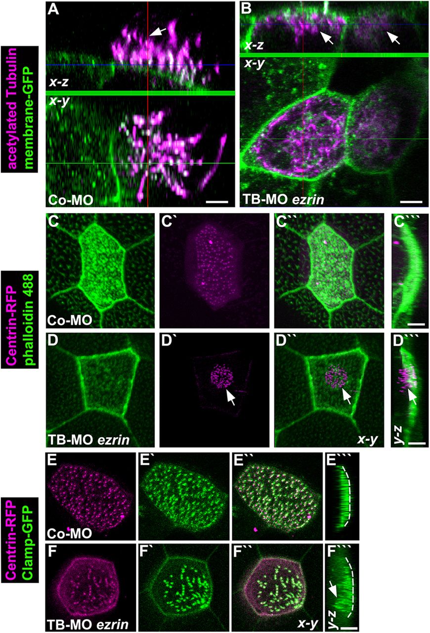 Fig. 4. Ezrin is required for ciliogenesis in Xenopus. (A,B) In Xenopus embryos (stage 32) injected with Co-MO (8 ng) the cell membrane was highlighted by overexpression of membrane-GFP. Immunostaining for acetylated Tubulin showed the ciliary axonemes protruding to the outside of the cell (A, arrow), whereas in embryos injected with TB-MO ezrin (8 ng) the acetylated α-Tubulin-positive structures mainly formed inside the cell (B, arrows). (C-D‴) Basal bodies marked by overexpression of Centrin-RFP aligned properly at the apical cell membrane labelled with phalloidin 488 in Xenopus embryos (stage 32) injected with Co-MO (8 ng) (C-C‴), in contrast to the failed migration and docking of basal bodies (arrows) in embryos injected with TB-MO ezrin (8 ng) (D-D‴). (E-F‴) Injection of a lower dose of TB-MO ezrin (4 ng) together with centrin-RFP and clamp-GFP mRNA (F-F‴) revealed partial basal body docking (arrow) and irregular basal body spacing compared with proper apically docked and evenly distributed basal bodies in embryos (stage 32) injected with Co-MO (4 ng) (E-E‴). Dashed white line indicates the apical surface. Scale bars: 5 μm. |
