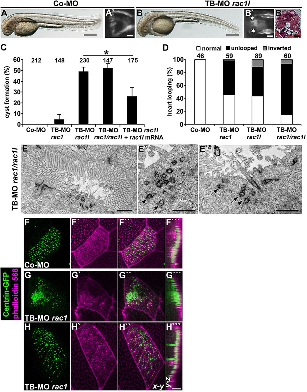 Fig. 6. Rac1 is required for ciliogenesis in zebrafish and Xenopus. (A-Bâ²) Expression silencing of Rac1l using TB-MO rac1l (0.5â ng) results in pronephric cyst formation (stars in Bâ² and Bâ²) as compared with Co-MO (0.5â ng) morphants (Aâ²), as shown in a dorsal view with anterior to the left of a Tg(wt1b:EGFP) zebrafish embryo (Aâ²,Bâ²) and in a histological transverse section (Bâ²) of a 48â hpf embryo. (A,B) Embryos are shown in bright-field lateral view, with anterior to the left. (C) Quantification of pronephric cyst formation in 48â hpf zebrafish embryos injected with Co-MO (4.5â ng), TB-MO rac1 (4â ng), TB-MO rac1l (0.5â ng), TB-MO rac1 (4â ng)/rac1l (0.5â ng) and TB-MO rac1l (0.5â ng)+ rac1l mRNA (20â pg). There was significant prevention of cyst formation by co-injection with rac1l mRNA (*Pâ¤0.05). (D) Quantification of laterality defects by cmlc2 in situ hybridisation revealed impaired heart looping in 48â hpf zebrafish embryos injected with TB-MO rac1 (4â ng), TB-MO rac1l (0.5â ng), and TB-MO rac1 (4â ng)/rac1l (0.5â ng) compared with Co-MO (4.5â ng). (C,D) The number of individual embryos analysed is indicated above each bar. (E-Eâ²) Analysis of electron micrographs revealed basal body docking defects (arrows in Eâ²,Eâ²) on sections of 48â hpf zebrafish embryos injected with TB-MO rac1 (4â ng)/rac1l (0.5â ng). (F-Fâ´) Xenopus embryos injected with Co-MO (40â ng) and centrin-GFP mRNA showed normal basal body docking and basal body distribution at stage 32; embryos were colabelled with phalloidin 568 (magenta). (G-Hâ´) Xenopus embryos (stage 32) injected with TB-MO rac1 (40â ng) exhibited irregular basal body docking and distribution, âbeads on a stringâ pattern in H. Scale bars: 100â μm in A,B; 20â µm in Aâ²,Bâ²; 50â µm in Bâ²; 1â µm in E-Eâ²; 5â µm in Hâ´. |