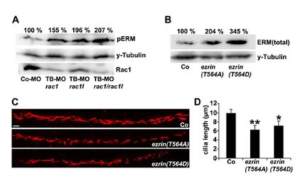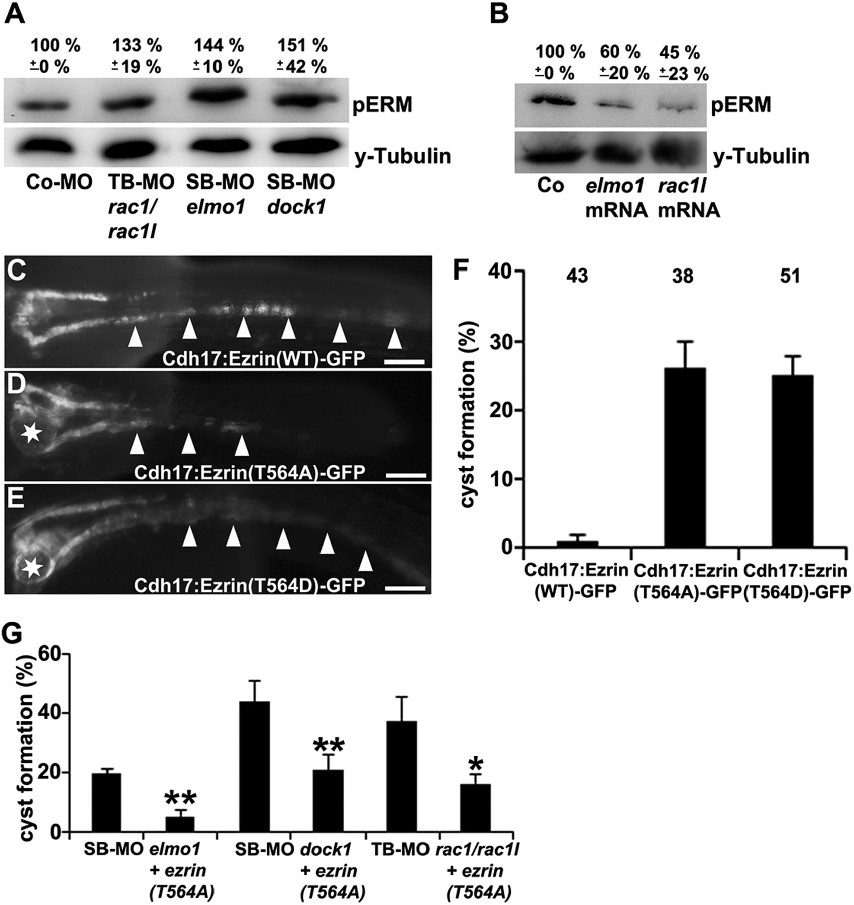 Fig. 7. The ELMO1-DOCK1-Rac1 complex influences ERM phosphorylation and tight control of phospho-Ezrin is required for proper ciliogenesis. (A) Immunoblot of 24â hpf zebrafish lysates showing elevated phospho-Ezrin (pERM) levels in embryos injected with TB-MO rac1 (4â ng)/rac1l (0.5â ng), SB-MO elmo1 (2â ng) and SB-MO dock1 (2â ng) as compared with Co-MO (4.5â ng). (B) Immunoblot of 24â hpf zebrafish lysates showing reduced pERM levels in zebrafish embryos injected with elmo1 mRNA (20â pg) or rac1l mRNA (20â pg) as compared with control embryos. Anti-γ-Tubulin immunoblots served as a loading control. Immunoblots represent results from one of three independent experiments with similar results. (C-F) Overexpression of Ezrin by transient transgenesis demonstrates the importance of tight regulation of phosphorylation at threonine 564 for the function of zebrafish Ezrin. cadherin 17 (cdh17) promoter-driven expression of either the nonphosphorylatable T564A mutation or the phosphorylation mimetic mutant T564D caused cyst formation on the side of the pronephros where the MCCs in the mid-portion of the pronephric tubule are most affected. Arrowheads indicate the tubular mid-portion, with the cells expressing mutant Ezrin on the side of the formed cyst. The number of individual embryos analysed is indicated above each bar. (G) Quantification of pronephric cyst formation of 48â hpf zebrafish embryos injected with SB-MO elmo1 (2â ng) with or without ezrin(T564A) mRNA (10â pg) (**P=0.006), SB-MO dock1 (2â ng) with or without ezrin(T564A) mRNA (10â pg) (**P=0.009) or TB-MO rac1 (4â ng)/rac1l (0.5â ng) with or without ezrin(T564A) mRNA (10â pg) (*P=0.02). Scale bars: 50â µm. |