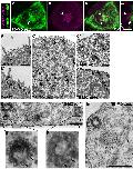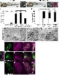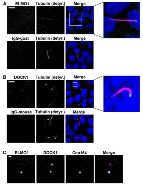 Supplemental Fig. S2. ELMO1 and DOCK1 localize to the basal body of primary cilia (A) MDCKs were grown to ciliated stage and stained against ELMO1 (green) and the cilia marker Tubulin (detyrosinated) (magenta). The merged image illustrates distinct ELMO1 staining at the base of the cilium. (B) DOCK1 (green) was co-stained with Tubulin (detyrosinated) (magenta). The merged image illustrates distinct DOCK1 staining at the base of the cilium. (C) ELMO1 (green) was co-stained with DOCK1 (magenta) and Cep164 (blue), a marker for the mother centriole. Co-localization of ELMO1 and DOCK1 at the mother centriole is indicated by yellow pixels. Scale bars, 10 μm (A,B), 1 μm (C). |