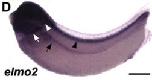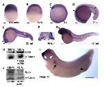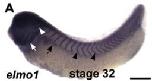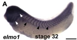 elmo2 (engulfment and cell motility 2) gene expression in Xenopus laevis embryo, assayed via in situ hybridization, NF stage 32, lateral view, anterior left, dorsal up. |