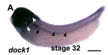 dock1 (dedicator of cytokinesis 1) gene expression in Xenopus laevis embryo, assayed via in situ hybridization, NF stage 32, lateral view, anterior left, dorsal up. |