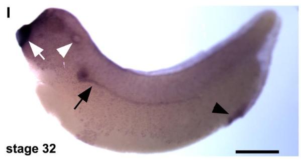 ezr (ezrin) gene expression in Xenopus laevis embryo, assayed via in situ hybridization, NF stage 32, lateral view, anterior left, dorsal up. |