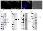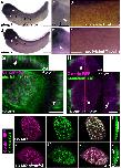(A) Ubiquitous distribution of maternal ezrin transcripts at 512-cell-stage. (B) At 60 % epiboly stage, ezrin is expressed ubiquitously. (C) At the 3-somite stage, expression of ezrin mRNA is restricted to the polster (black arrowhead). (D) At the 20-somite stage ezrin shows expression in the otic vesicle (black arrowhead) and the developing pronephric tubule (black arrow). (E) At 22 hpf ezrin expression is detected in the forebrain (black arrow), epiphysis (black arrowhead), otic vesicle (white arrowhead) and the pronephric tubule (white arrow). Cross-section of a 36 hpf embryo (F) shows that ezrin (blue) partially co-localizes with cadherin 17 (red) in the pronephric tubule. (G) At 48 hpf, ezrin has a broad expression throughout the brain, epiphysis (black arrowhead) and pronephric tubule (white arrow). (H) Immunoblot of 24 hpf zebrafish lysates after injection of ezrin mRNA indicates a strong upregulation of Ezrin expression in comparison to control embryos. Anti-γ-Tubulin immunoblot served as loading control. (I) ezrin is expressed in the cement gland (white arrow), otic vesicle (white arrowhead), pronephros (black arrow), cloaca (black arrowhead) and throughout the epidermis at stage 32 of Xenopus development. (J) Immunoblot of Xenopus lysates (stage 32) after injection of TB-Mo ezrin (8 ng) into the animal-ventral blastomeres of four-cell stage Xenopus embryos indicates a reduction of Ezrin expression compared to Co-MO (8 ng) injected embryos. Anti-γ-Tubulin immunoblot served as loading control. Scale bars, 100 μm (A,B,C,D,E,G), 20 μm (F), 500 μm (I). |