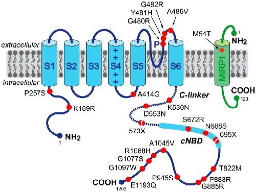 Figure 1. Schematic topology of the HCN4 and MiRP1 proteins. The HCN4 α-subunit has six transmembrane segments (S1–S6), a pore-forming loop (P) and intracellular N- and C-termini. The voltage sensor of the channel is formed by the positively-charged S4 helix. The C-terminus comprises the C-linker (dotted line) and the cyclic nucleotide-binding domain (cNBD), which is known to mediate cyclic AMP (cAMP)-dependent changes in HCN channel gating. The MiRP1 β-subunit has a single transmembrane segment with an extracellular N-terminus and intracellular C-terminus. Red dots indicate the location of the 23 known HCN4 and MiRP1 mutation sites associated with clinically established or potential sinus node dysfunction. The split dots indicate the truncations resulting from the 573X and 695X non-sense (truncating) mutations.