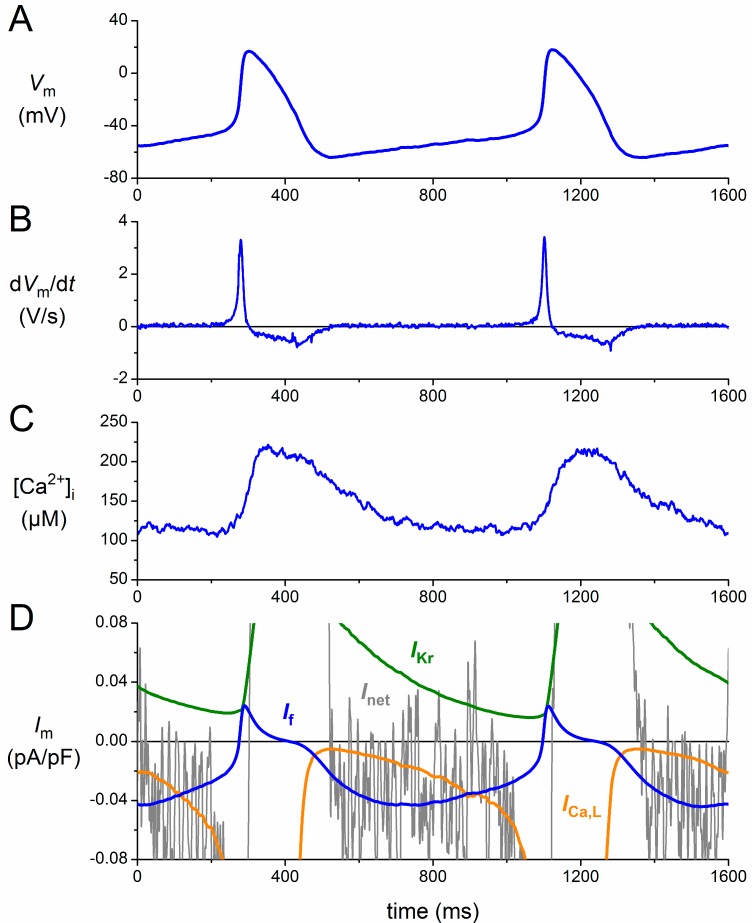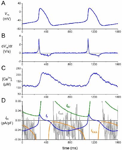 Figure 2. Membrane currents of a human sinoatrial node (SAN) pacemaker cell assessed by a simulated action potential clamp. (A) Action potentials recorded from a human SAN pacemaker cell used for the action potential clamp; (B) associated rate of change of the membrane potential (dVm/dt); (C) global intracellular calcium concentration ([Ca2+]i) in a different cell with a highly similar cycle length; and (D) numerically reconstructed membrane current (Im): L-type calcium current (ICa,L), If, delayed rectifier potassium current (IKr) and net membrane current (Inet). See the text for details.